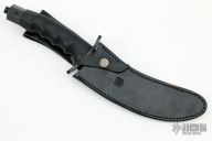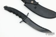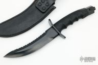 This Black Warrior from Al Mar Knives features a black coated blade with serrated top edge, .235" blade stock and 1.480" blade depth, hidden tang construction. The handle has a black stainless steel double guard, black rubberized handle, and a black stainless steel butt. Comes with original black leather sheath. Has a couple light scratches, otherwise excellent condition.