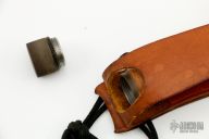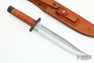This SF-10 from Al Mar Knives is a large hollow handled survival knife with super sharp serrations on spine, .227" stock and 1.543" blade depth. Screw off handle cap and cord wrapped handle. Comes with a brown leather sheath with belt loop. Hard to find piece. Has some light scuffs, otherwise excellent condition. Comes with original wooden display box.