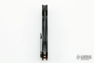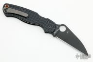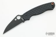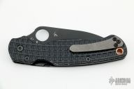This Paramilitary 2 Liner lock Folder from Spyderco has a black wharncliffe blade with thumbhole and notched thumbrest. Handle has black milled aluminum scales by Ripps Garage Tech, nested stainless steel liners and tumbled titanium tip up clip. Comes with original box and papers. Has some scuffs, otherwise excellent condition.