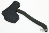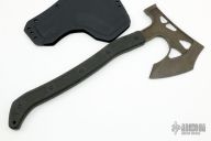 At 15 inches in length, you have plenty of handle to get leverage for chopping, and at 17 oz. you can swing this axe like a machete and gain an enormous amount of kinetic energy. The balance point is just behind the top of the handle, so as a combative tool it will feel very light and fast in the hand. As a camp tool you will find the hammer is helpful for pounding in tent stakes and driving wedges for snares. The bevels are scalloped to guide the edge into the cut and reduce the number of glancing blows. The top edge is inspired by the Sayoc Kali style of fighting axe as a penetrating tip and hard object smasher! The handle is fully enclosed and sealed to prevent the user from being shocked if they cut through live electrical wires. The handle is also generously textured to give the user a firm grip in any condition, while not being so aggressive as to give blisters after extended use. The sheath is vacuum-formed and perfectly molded for protecting the axe and yourself from most environments. Specifications: Length: 15” Head: Top Edge 2.17”, Bottom Edge 3.5” Hammer: 1.1" Forward Edge to Hammer: 6.25” Steel: 1/4” Oversized Thickness, 80CrV2 Steel Finish: Fallout Black Handle: Black Paper Micarta, Insulated, Non-Conductive. Hardness: Striking Surfaces 56 HRC, Tang 45 HRC Weight: 22.5 oz. With Scabbard, 17 oz. Without Sheath: Bottom-eject Kydex Features: Full internal/external lightening pockets Non-conductive handle Insulated handle hardware. Excellent condition.