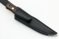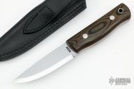 This Dangler by Dave Beck features a hand rub satin finished scandi ground blade with .119" blade stock and 1.116" blade depth, full tang construction. The handle has black/green linen micarta scales. Comes with a black leather sheath. New from maker.