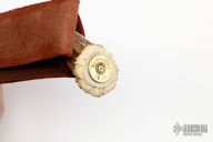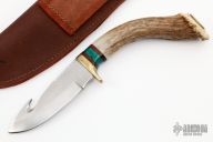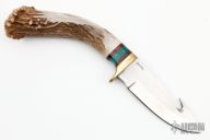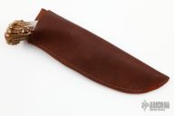 This knife by Mike Newland features a satin finished blade with notched thumbrest and guthook, .154" blade stock and 1.237" blade depth, hidden tang construction. The handle has a brass guard, crown stag grip with wood and acrylic spacers. Comes with a brown leather sheath. Has a couple light scratches, otherwise good condition.