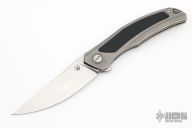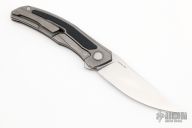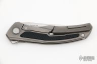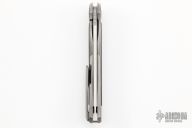 This Quantum Ursus by Shirogorov features a tumble finish blade with notched thumbrest and flipper. The handle has a blasted and milled titanium frame, G10 inlays, backspacer, tip up titanium clip with hidden screws. Rides on SRBS, nice detent, lockup and blade seating. Comes with original box and COA. New condition. Cromax PM blade steel.