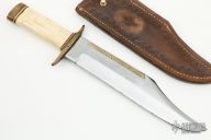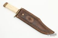 This Bowie by Dan Dennehy features a mirror finished clip point blade with sharpened top edge and an engraved brass parry guard, .246" blade stock and 2.233" blade depth, hidden tang construction. The handle has an engraved brass guard and butt, ground stag grip with red/white spacers. Comes with a hand tooled brown leather sheath. Has a couple light scratches and some small oxidation spots on the blade, otherwise good condition.