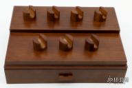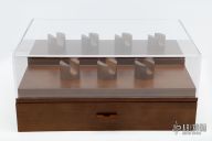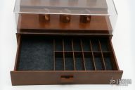 This wooden display case can hold 7 knives up top. it has a drawer with twelve 1"x 4.25" slots. Excellent condition. Case is 15"x10.5"x7"