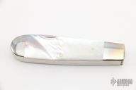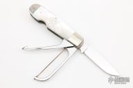 This Slipjoint by Robert Enders features a mirror polished blade with nail nick, a small bone saw and a gut hook. The handle has nickel silver bolsters with integral liners, mother of pearl covers and stainless steel springs. Half stop on blades. Comes with a zippered case. Has a few light scratches, otherwise excellent condition. Never seen anything like this! Super cool.