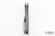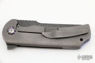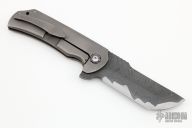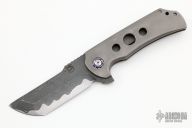 This Tanto Framelock Flipper from Michael Burch features a San Mai Damascus blade with notched thumbrest and a flipper. The handle has an orange peel finished and tumbled titanium frame, floating mokuti backspacer and pivot collars, tip up titanium clip with hidden screws. Rides on bearings, nice detent, lockup and blade seating. Has a few scuffs and scratches, otherwise excellent condition.
