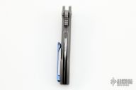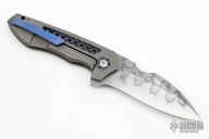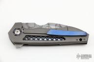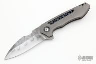 This Vented Impetus flipper from Michael Burch features a hand rub satin finished blade with nice hamon, notched thumbrest and flipper. The handle has a bead blasted titanium frame with anodized cutout millings and anodized tip up clip with hidden screws, zirconium pivot collars and backspacer. Nice detent, lockup and blade seating, rides on bearings. Excellent condition.