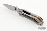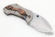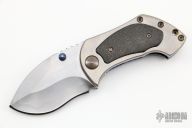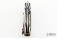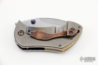This Pimpsqueak framelock folder by Neil Blackwood features a hand rub satin finished blade with hamon, dual thumbstuds and notched thumbrest. The handle has an orange peel finished titanium frame with lightning strike carbon fiber inlay, brass and copper 3-piece backspacer, and tip up textured copper clip, inside of frame is anodized and jeweled. Nice detent, lockup and blade seating. Has a couple light scuffs, otherwise excellent condition.