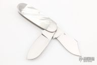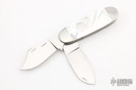 This Elephant Toe by Joe Knipstein features hand rub satin finished blades with nail nicks. The handle has stainless steel bolsters with integral liners, stainless steel springs, stainless steel escutcheon, mother of pearl covers. #001 on blade. Comes with a zippered case. Excellent condition.