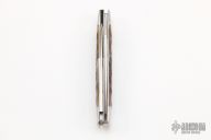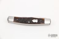 This Muskrat 2-blade by Eugene Shadley features two hand rub satin finished blades with nail nicks. The handle has pinched and polished stainless steel double bolsters with integral liners, jigged bone covers with a stainless steel shield escutcheon, stainless steel springs. Has half-stops, flush in all positions. Excellent condition. Comes with a zippered case. #556