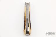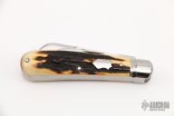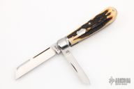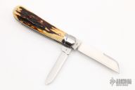 This 2-Blade Swayback Slipjoint by Reese Bose features hand-rubbed satin finish blades with nail nicks. The handle has fluted stainless bolsters, stag covers, stainless steel liners, springs and escutcheon. Has half-stops, flush in all positions. Excellent fit and finish. Excellent Condition. Comes with a zippered case. #1