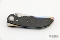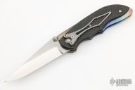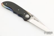 This linerlock by Allen Elishewitz features a satin finish blade with a dual thumbstuds. The handle has contoured carbon fiber scales, anodized titanium liners and carbon fiber backstrap. Strong lock up, and nice detent. Comes with original nylon sheath. Has some light scuffs and scratches, Excellent condition otherwise.