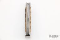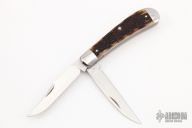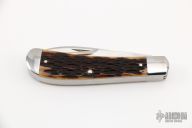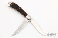 This Trapper by Tony Bose features two satin finish blades both with nail nicks. The handle has stainless steel bolsters and liners, jigged bone covers, stainless steel springs. Half stops on blades, flush in all positions. Includes a padded zippered case. Excellent Condition.
