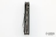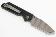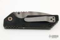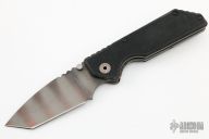 This early AR Tanto by Strider Knives features a tiger stripe blade with notched thumbrest and single thumbstud. The handle has black G-10 scales, tumbled titanium liners, and matching tip up clip. Has scuffs and scratches, great condition otherwise.
