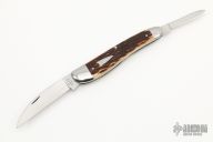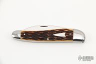 This 2-Blade Seahorse Whittler by Dan Burke features hand rub satin finished blades with nail nicks. The handle has stainless steel bolsters, jigged bone covers with a stainless steel escutcheon, stainless steel liners and spring. Includes a padded zippered case. Has a couple light scratches, otherwise excellent condition. #3