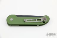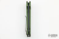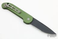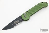 This UDT by Microtech has a bead blasted blade with partial serrations. Stainless steel clip, tip up carry. Silver posts. Green aluminum handle with lanyard hole. Side opening coil-spring automatic. Comes with original box, sheath and papers. Has some scuffs and scratches, otherwise good condition. Hard to find.