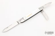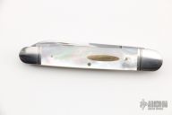 This slipjoint by Eugene Shadley features 3 hand rub satin finished blades with nail nicks. The handle has stainless steel fluted bolsters, mother of pearl covers with a gold escutcheon and pins, stainless steel liners and springs. Has a couple light scratches, otherwise excellent condition. #1238 on the blade. Comes with a velcro case.