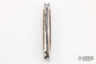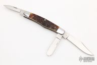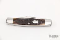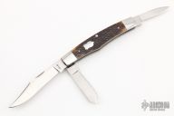This Muskrat 3-blade by Eugene Shadley features hand rub satin finished blades with nail nicks. The handle has pinched and polished stainless steel double bolsters and liners, jigged bone covers with a stainless steel shield escutcheon, stainless steel springs. Has half-stops, flush in all positions. Excellent condition. Comes with a zippered case. #525
