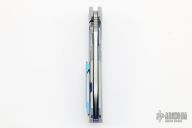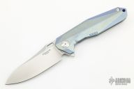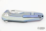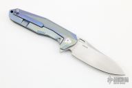 This knife by Rike Knife features a bead blasted blade with dual thumbhole, notched thumbrest and flipper. The handle has a stonewashed, anodized and milled titanium frame with matching tip up clip and backspacer, has stainless lockface insert. Nice detent, lockup and blade seating. Rides on caged bearings. Comes with nylon zippered case. #018 on blade. Has a couple light scratches, otherwise excellent condition.