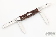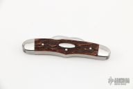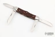 This slip joint by Terry Davis features hand rub satin finished blades with nail nicks. The handle has stainless steel bolsters with integral liners, stainless steel springs, jigged bone covers with a stainless steel escutcheon. Has half-stops, flush in all positions. Comes with a zippered case. Excellent condition. Dated 2000.