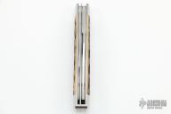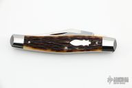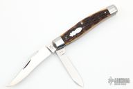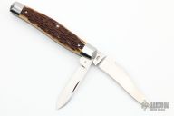 This Texas Jack by Tony Bose features two hand rub satin finished blades both with nail nicks. The handle has stainless steel bolsters and liners, jigged bone covers, stainless steel escutcheon and springs. Half stops on blades, flush in all positions. Includes a padded zippered case. Excellent Condition. #3