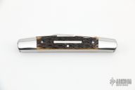 This Congress slipjoint by Joel Chamblin features hand-rubbed satin finished blades with nail nicks, one blade is a nail file. The handle has stainless steel bolsters and liners, jigged bone covers with a stainless steel escutcheon and springs. Comes with a zippered case. Excellent Condition.