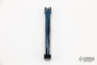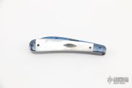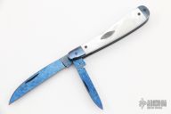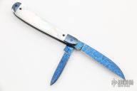 This 2-Blade Swayback by Dan Burke features blued Damascus blades with nail nicks. The handle has blued Damascus bolsters, mother of pearl covers with a blued Damascus escutcheon, blued stainless steel liners and springs. Includes a padded zippered case. Has half-stops, flush in all positions. Has a couple light scratches, otherwise excellent condition.
