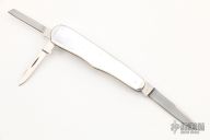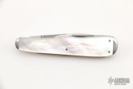 This lobster knife by Dan Burke features three hand-rubbed satin finish blades and a pick, high polish stainless steel double bolsters, mother of pearl covers, coin edged stainless steel liners. Blades open and close with a nice snap. Excellent Condition. Comes with a zippered case.