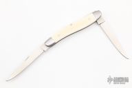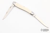 This slipjoint by Bill Simons features satin finished blades with nail nicks. The handle has stainless steel bolsters, mammoth ivory covers, stainless steel liners and spring. #113 inside the spring. Comes with a zippered case. Excellent condition.
