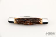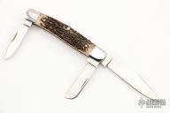 This 3-Blade Stockman by Joel Chamblin features hand rub satin finished blades with nail nicks. The handle has stainless steel bolsters with integral liners, stag covers, stainless steel springs. Comes with a zippered case. Excellent condition.
