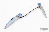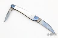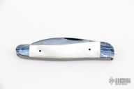 This 2-Blade slipjoint by Dan Burke features blued Damascus blades with nail nicks. The handle has blued mosaic Damascus bolsters, mother of pearl covers, blued steel liners and spring. Has half-stops. Includes a padded zippered case. Excellent condition.