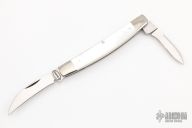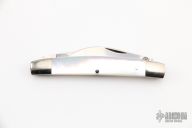 This 2-Blade Congress by Dan Burke features hand rub satin finished blades with nail nicks. The handle has stainless steel bolsters, mother of pearl covers with a stainless steel liners and spring. Has half-stops. Includes a padded zippered case. Has a couple light scratches, otherwise excellent condition.