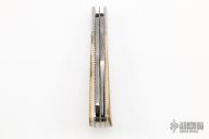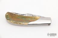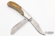 This slipjoint by Bill Simons features Damascus blades with nail nicks. The handle has stainless steel bolsters, mammoth ivory covers, fileworked stainless steel liners, and stainless steel springs. #253. Excellent condition. Comes with a zippered case.