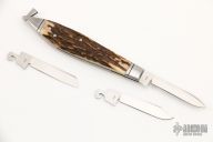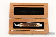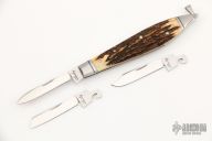 This Swicha-Blade Teardrop Whittler by Eugene Shadley features 3 interchangeable hand rub satin finished blades with nail nicks. The handle has fluted stainless steel bolsters with integral liners, stag covers, stainless steel spring and lanyard bail. The spring tension is removed by pulling up on the lanyard bail. It is a little tough the first time, but once you do it, it is easier. Once the tension is released, the blade will slide out of the front of the knife. To put a blade in, slide it into the knife, under the pivot pin, into the closed position. It only goes in and out in this position. All blades are marked 1241. Has a half stop. Comes with a wooden box that holds the knife and blades. Excellent condition. Comes with COA 5/26/09.