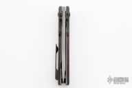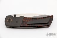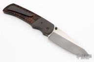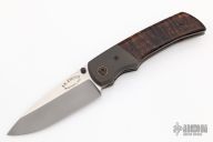 This Gulo from Steven Kelly Knives features a two-tone drop point blade with dual titanium thumbstuds. The handle has bead blasted titanium bolsters, liners and a tip up clip with hidden screws. Stabilized KOA scales. Nice detent, lockup and blade seating.  Includes a padded zippered case.  Excellent Condition.