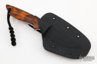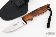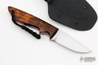 This Rodney Rogers Design Skinner by David Lancaster Clark features a hand rub satin finished blade with .164" blade stock and 1.113" blade depth, full tang construction. The handle has desert ironwood scales with black linen micarta pins. Comes with a kydex sheath. New from maker.