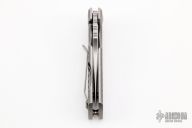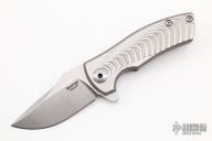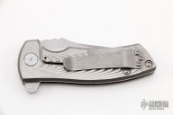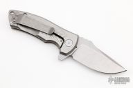 This ESV Flipper by Les George features a stonewash finished Magnacut blade with notched thumbrest and a flipper. The handle has a milled stonewashed titanium frame and titanium pocket clip for tip up carry. Smooth function with a lock up and nice detent. New from maker! Comes with a zippered case.