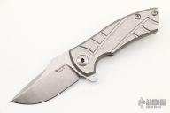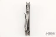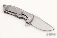 This ESV Flipper by Les George features a stonewash finished Magnacut blade with notched thumbrest and a flipper. The handle has a milled stonewashed titanium frame and titanium pocket clip for tip up carry. Smooth function with a lock up and nice detent. New from maker! Comes with a zippered case.