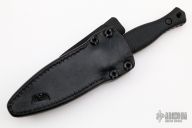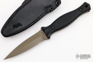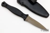 This Galvo Dagger by Les George features an FDE ceracoated double-edged blade with .170" blade stock and .894" blade depth, full tang construction. The handle has black Groovy G-10 scales and a lanyard hole. Comes with a black leather sheath by Chatanooga Leatherworks. Comes with original box. New from maker, Les George, the man, the myth, the legend.
