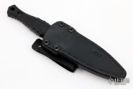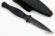 This Galvo Dagger by Les George features an Black ceracoated double-edged blade with .170" blade stock and .894" blade depth, full tang construction. The handle has black Tephra G-10 scales and a lanyard hole. Comes with a black leather sheath by Chatanooga Leatherworks. Comes with zipper case. New from maker, Les George, the man, the myth, the legend.