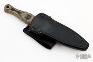 This Galvo Dagger by Les George features an FDE ceracoated double-edged blade with .170" blade stock and .894" blade depth, full tang construction. The handle has black/bown/green Tephra G-10 scales and a lanyard hole. Comes with a black leather sheath by Chatanooga Leatherworks. Comes with original box. New from maker, Les George, the man, the myth, the legend.