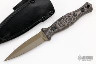 This Galvo Dagger by Les George features an FDE ceracoated double-edged blade with .170" blade stock and .894" blade depth, full tang construction. The handle has Black/Brown/Gray Tephra G-10 scales and a lanyard hole. Comes with a black leather sheath by Chatanooga Leatherworks. Comes with original box. New from maker, Les George, the man, the myth, the legend.