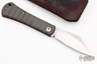 This G.A.F. by James Brad Blount features a tumbled clip point blade with swedge. The handle is comprised of a bead blast and flame anodize finish titanium over steel spring. Lanyard hole in pommel. Strong pull and the spring is flush in the open, closed and half stop positions. Comes with a brown leather pocket sheath. Has some marring on the hardware, handle finish is not original. Excellent condition otherwise.