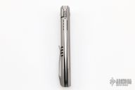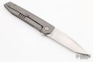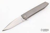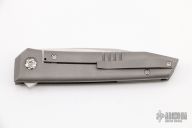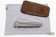 This PRIML flipper by Jared Oeser features a hand rub satin finished blade with a notched flipper. The handle has a lightly textured bead blasted titanium frame, tip up clip and layered g10 backspacer with lanyard bail. Nice detent, lockup and blade seating. Comes with original box, leather sheath, cloth and COA dated 6-28-21. Excellent condition.