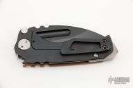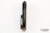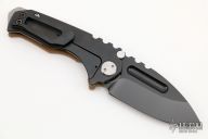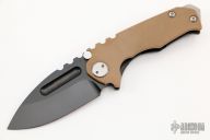 The Micro Praetorian from Medford Knife and Tool features a black PVD finished blade made from D2 steel with fuller/thumb grooves and a notched thumbrest. The handle has a coyote brown G-10 and a tumbled and black titanium lockside over a steel backspacer/glass breaker. Tumbled finished tip up pocket clip.  Nice detent, lockup and blade seating. Includes original plastic vault style case and outer box.  Excellent condition.