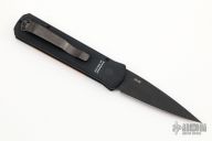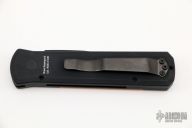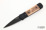 This Godson Steampunk side opening button lock auto from Pro-Tech (#166 of 200) has a black coated spear point blade with false top edge. Handle is black aluminum with Copper Shaw designed Steampunk A-side inlay, and black coated stainless steel tip up clip. Comes with original box and packaging. Has a couple light scuffs, otherwise excellent condition.