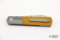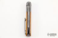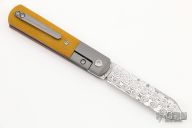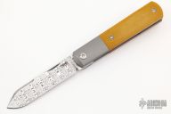 This Barlow Front Flipper by Enrique Pena features a Damascus blade with a front flipper and notched thumbrest. The handle has titanium bolsters, micarta scales with a titanium backspacer and matching tip up pocket clip. Includes the original box.  Excellent condition.