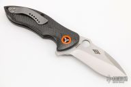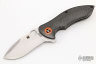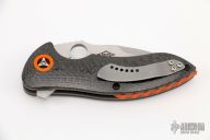 This Rubicon is a Peter Carey design by Spyderco, it features a satin finished spear point blade with thumbhole, notched thumbrest and flipper. The handle has carbon fiber scales with orange G-10 pivot surround and backspacer, tumbled titanium liners and a tip up stainless steel clip. Nice detent, lockup and blade seating. Comes with original zippered case. Has a couple light scuffs, excellent condition otherwise.