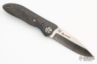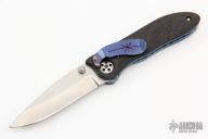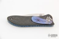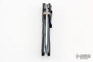 This linerlock by Allen Elishewitz features a satin finished blade with a dual thumbstuds. The handle has contoured carbon fiber scales, anodized titanium liners and barrel spacers. Strong lock up, and nice detent. Comes with original nylon sheath. Excellent condition.